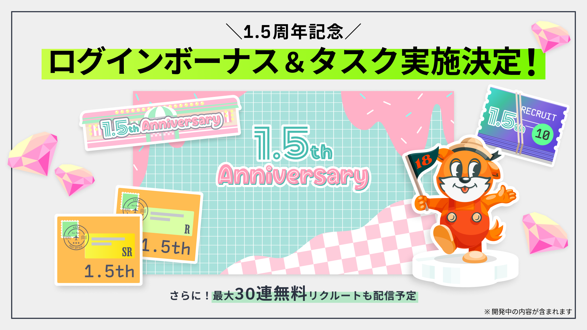 1.5周年を記念したログインボーナスとタスクの実施が決定しました!ダイヤやリクルートチケットがもらえるほか、ロビー機能で配置できる1.5周年記念インテリアなどがゲットできます!