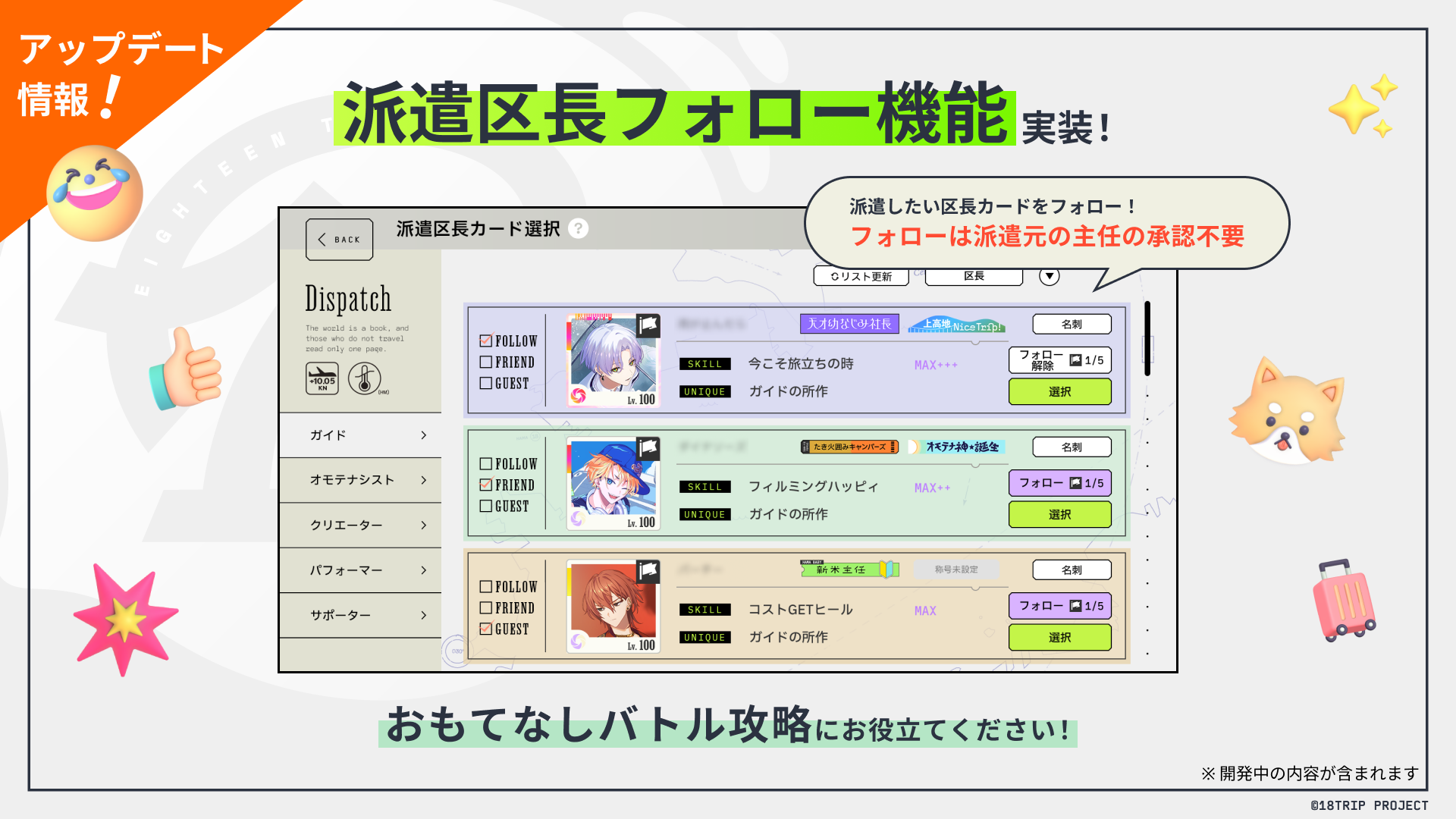 フォローした派遣カードが派遣リスト上部に出てくるのでバトル攻略に有利なカードが借りやすくなります!フレンド承認なしで使える機能ですので、バトル攻略時にご活用ください♪