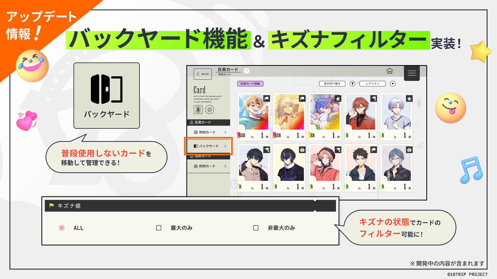 普段使用しないカードをバックヤードに移しておくことで編成時のカード探しを時短できる機能です!またカード一覧のフィルター機能にキズナ項目も追加実装されています!